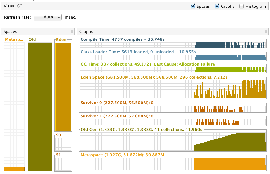 类加载并没有什么异常,但对象创建就不太正常了,创建Object对象接近800万个,另外从jvisualvm的GC图中可以看到一直在创建新对象,并且来不及销毁,所以eden区和old generation区一直是满的,所以GC对应的3个线程一直在满负荷运作,每个GC线程消耗的CPU都是接近100%的。