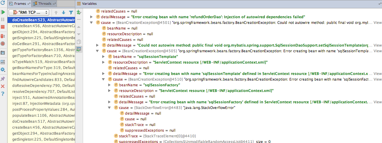 由显示结果可以看到,spring一直处理运行时异常相关的方法调用,加入断点之后,再进行调用方法栈的追溯,发现在创建sqlSessionFactory的bean时,发生了StackOverflowError的错误,并且spring在AbstractAutowireCapableBeanFactory中捕获了StackOverflowError,并转化成运行时异常,再重新抛出运行时异常BeanCreationException,在高层代码中捕获了这个运行时异常,并继续创建其他的spring的bean,而mybatis里的Dao又会依赖到sqlSessionFactory,又再次创建sqlSessionFactory这个bean,从而发生死循环了。
