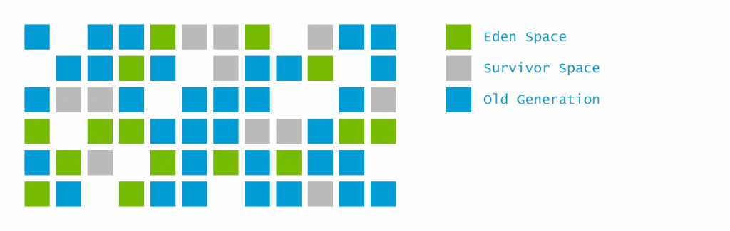 To achieve this, G1 builds upon a number of insights. First, the heap does not have to be split into contiguous Young and Old generation. Instead, the heap is split into a number (typically about 2048) smaller heap regions that can house objects. Each region may be an Eden region, a Survivor region or an Old region. The logical union of all Eden and Survivor regions is the Young Generation, and all the Old regions put together is the Old Generation: