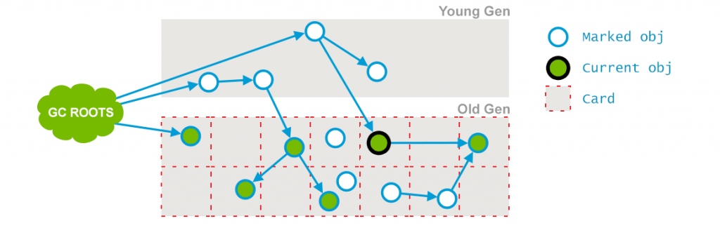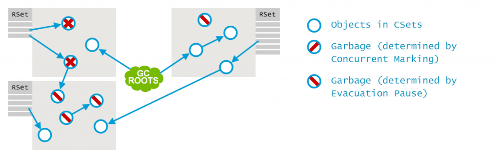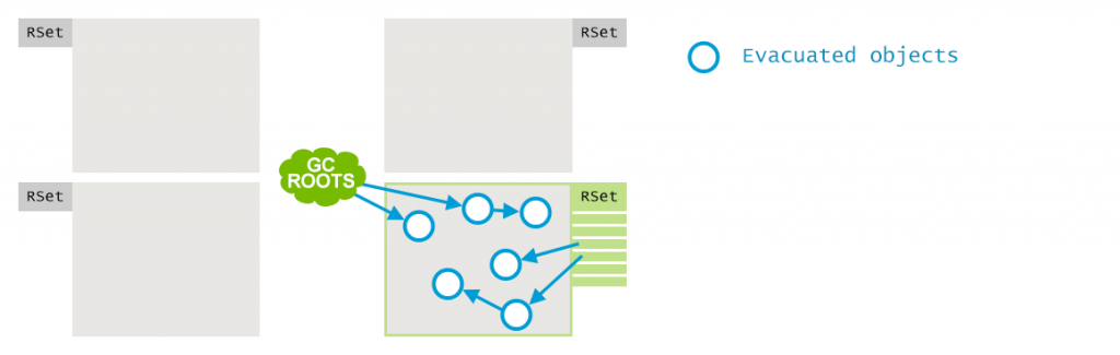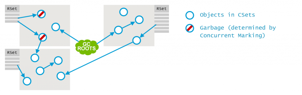 As shown in the illustration below, each region has a remembered set that lists the references pointing to this region from the outside. These references will then be regarded as additional GC roots. Note that objects in Old regions that were determined to be garbage during concurrent marking will be ignored even if there are outside references to them: the referents are also garbage in that case.