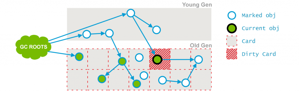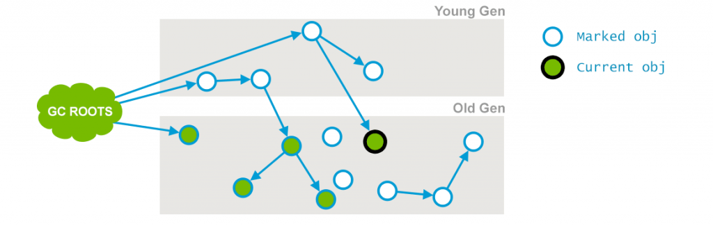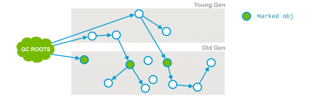 This information is then used to perform garbage collection in the Old regions. It can happen fully concurrently, if the marking determines that a region contains only garbage, or during a stop-the-world evacuation pause for Old regions that contain both garbage and live objects.