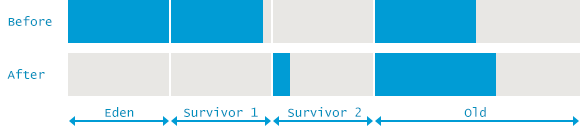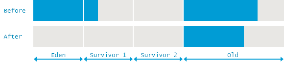 The difference with Minor GC is evident – in addition to the Young Generation, during this GC event the Old Generation and Metaspace were also cleaned. The layout of the memory before and after the event would look like the situation in the following picture: