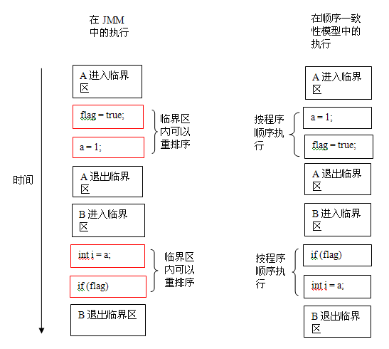 下图展示了这三类程序在 JMM 中与在顺序一致性内存模型中的执行结果的异同: