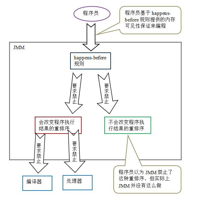 happens-before规则能满足程序员的需求。JMM 的happens-before规则不但简单易懂,而且也向程序员提供了足够强的内存可见性保证(有些内存可见性保证其实并不一定真实存在,比如上面的 Ahappens-beforeB)。 - JMM 对编译器和处理器的束缚已经尽可能的少。从上面的分析我们可以看出,JMM 其实是在遵循一个基本原则: