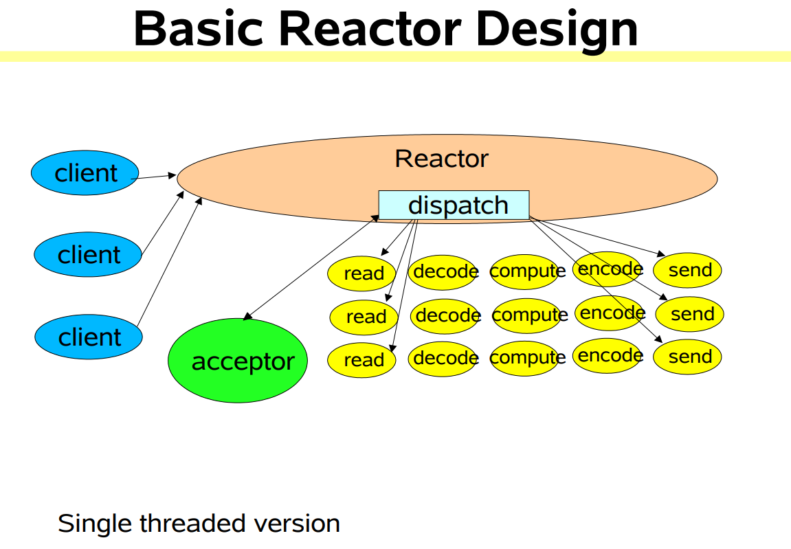 - Reactor responds to IO events by dispatching the appropriate handler