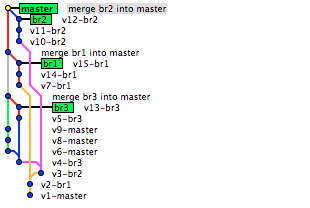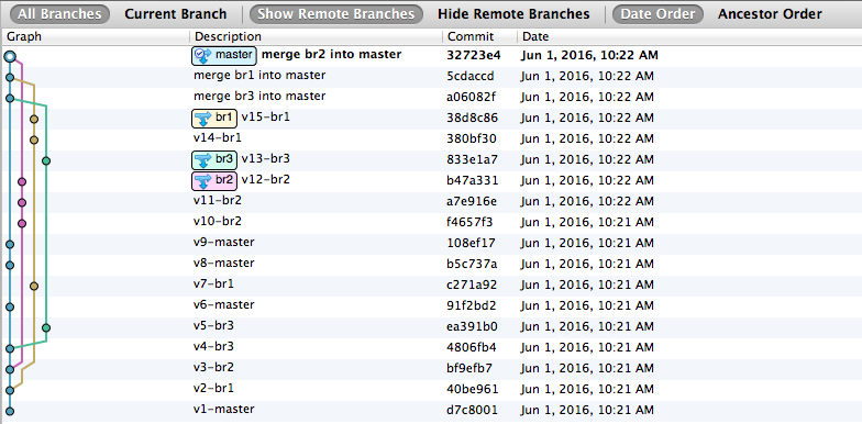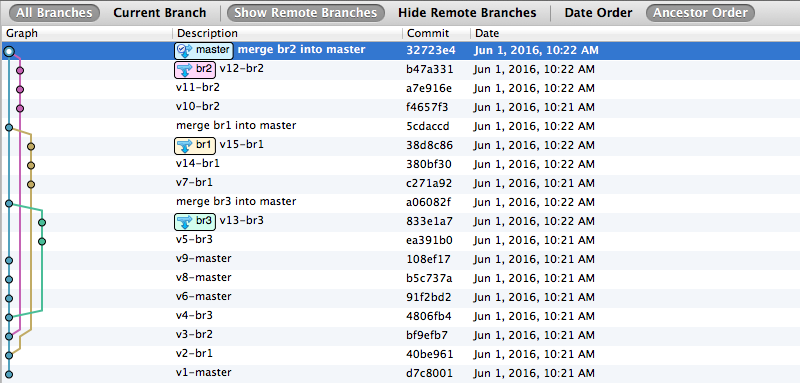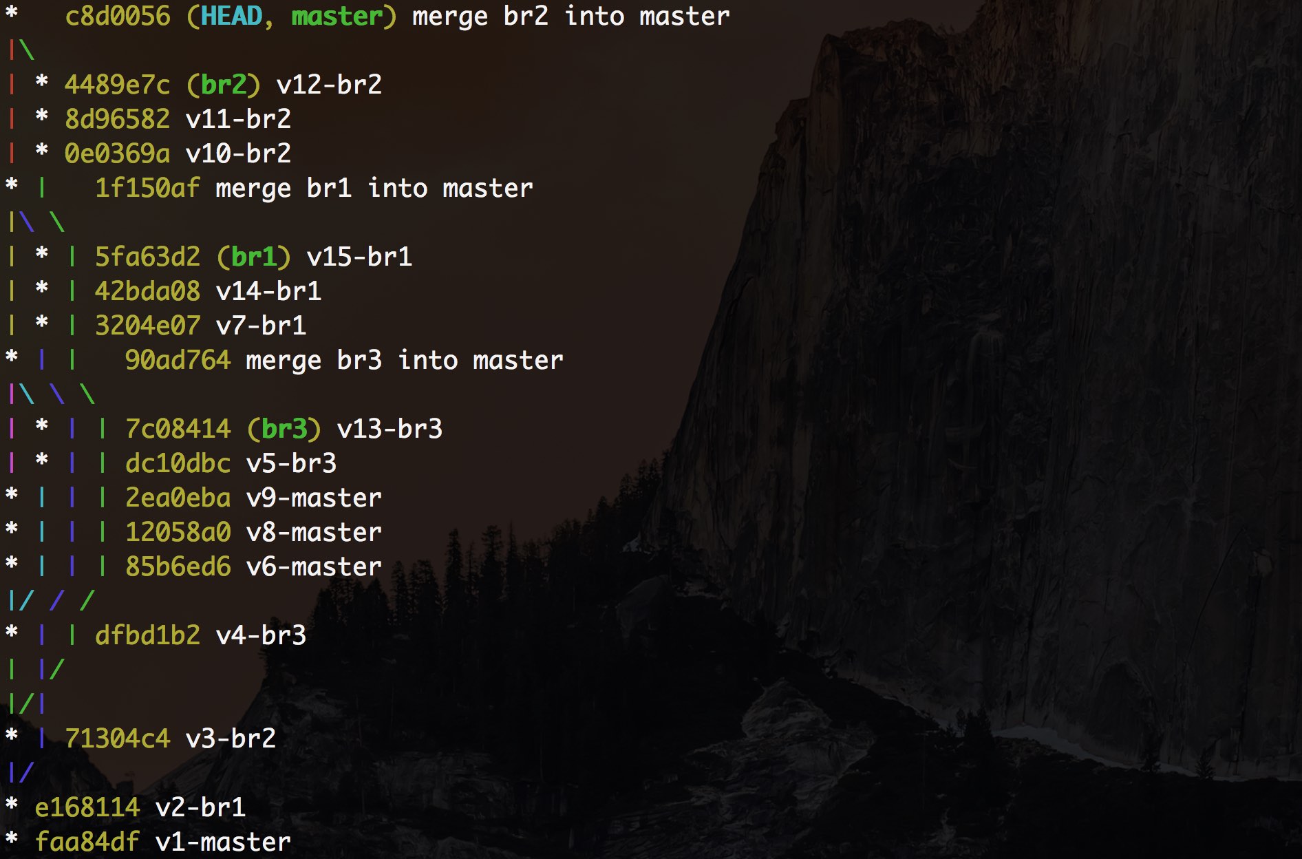 git config --global alias.co checkoutgit config --global alias.br branchgit config --global alias.ci commitgit config --global alias.st status[ -a git-branch-test.git ] && rm -rf git-branch-test.git[ -a git-branch-logs ] && rm -rf git-branch-logsgit init --bare git-branch-test.gitgit clone git-branch-test.git git-branch-logscd git-branch-logsecho v1 > v1.txtgit add -Agit commit -m v1-mastersleep 2sgit checkout -b br1git branchecho v2 > v2.txtgit add -Agit commit -m v2-br1sleep 2sgit branchgit checkout -b br2echo v3 > v3.txtgit commit -m v3-br2sleep 2sgit add -Agit commit -m v3-br2sleep 2sgit checkout -b br3echo v4 > v4.txtgit add v4.txtgit commit -m v4-br3sleep 2sgit checkout mastergit merge br3 -m "merge br3 into master"git checkout br3echo v5 > v5.txtgit add -Agit commit -m v5-br3sleep 2sgit checkout masterecho v6 > v6.txtgit add -Agit commit -m v6-mastersleep 2sgit checkout br1echo v7 > v7.txtgit add -Agit commit -m v7-br1sleep 2sgit checkout masterecho v8 > v8.txtgit add -Agit commit -m v8-mastersleep 2secho v9 > v9.txtgit add -Agit commit -m v9-mastersleep 2sgit checkout br2echo v10 > v10.txtgit add -Agit commit -m v10-br2sleep 2secho v11 > v11.txtgit add -Agit commit -m v11-br2sleep 2secho v12 > v12.txtgit add -Agit commit -m v12-br2sleep 2sgit checkout br3echo v13 > v13.txtgit add -Agit commit -m v13-br3sleep 2sgit checkout br1echo v14 > v14.txtgit add -Agit commit -m v14-br1sleep 2secho v15 > v15.txtgit add -Agit commit -m v15-br1sleep 2sgit checkout mastergit merge br3 -m "merge br3 into master"git merge br1 -m "merge br1 into master"git merge br2 -m "merge br2 into master"git log --oneline --decorate --graph --all |