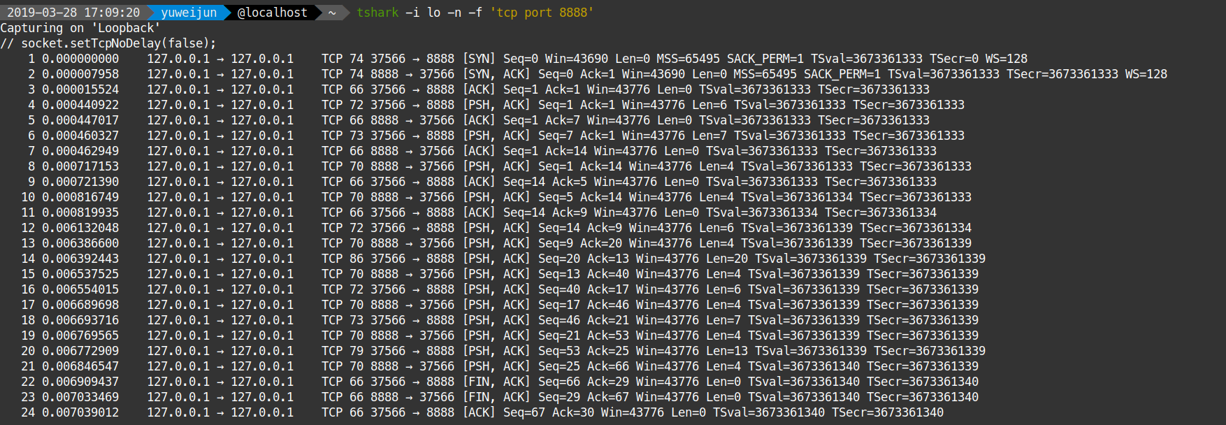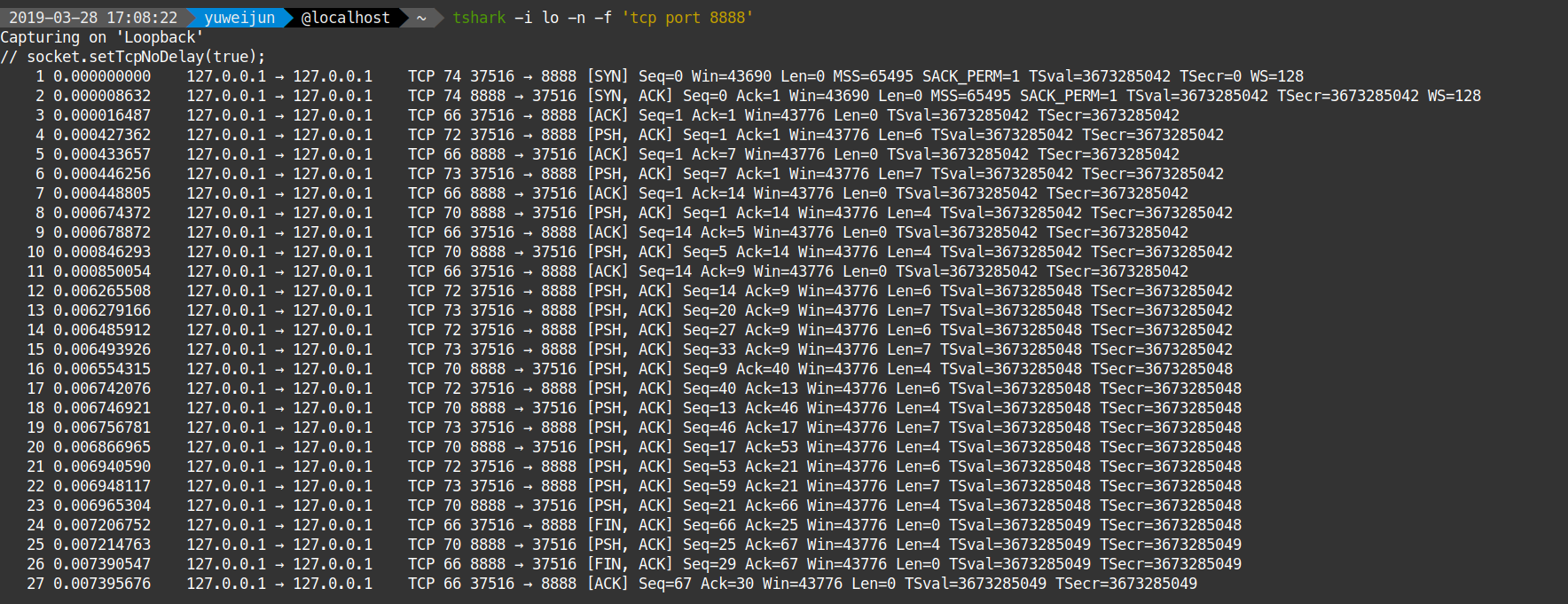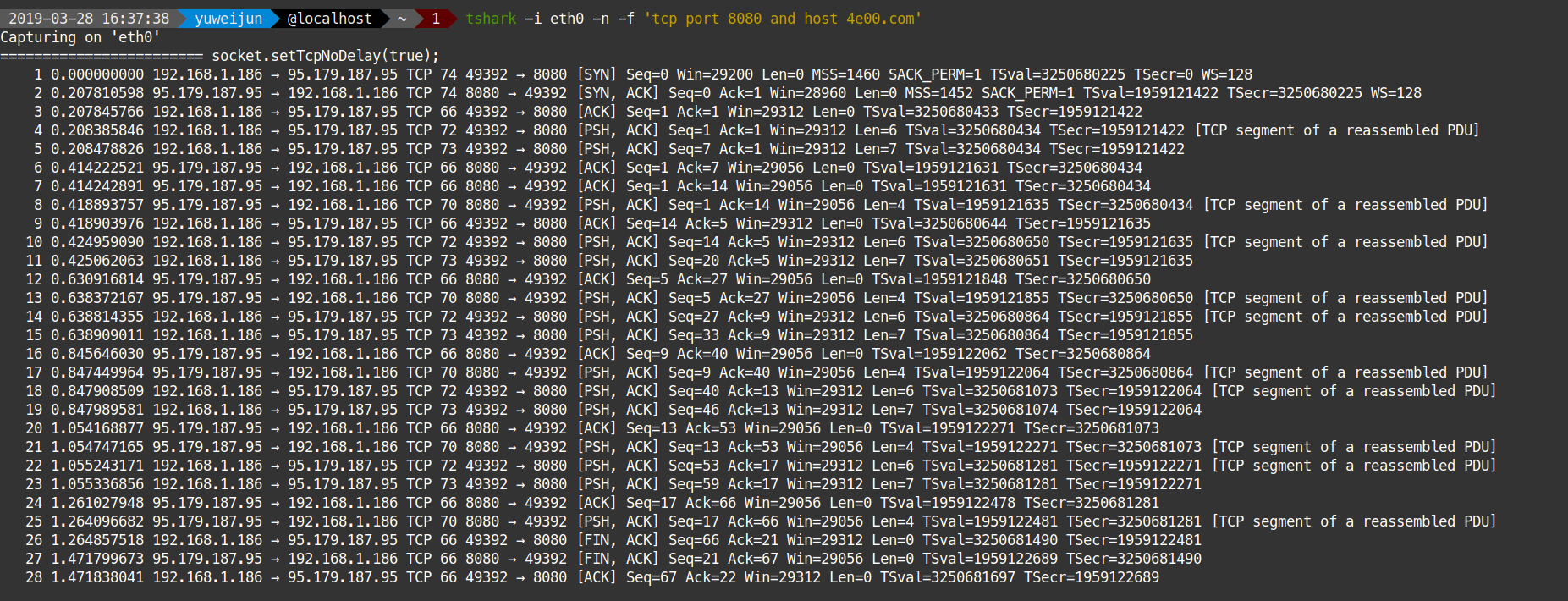 不管数据包大小都被即时发送给服务端了,这里来回一共 28 个数据包。