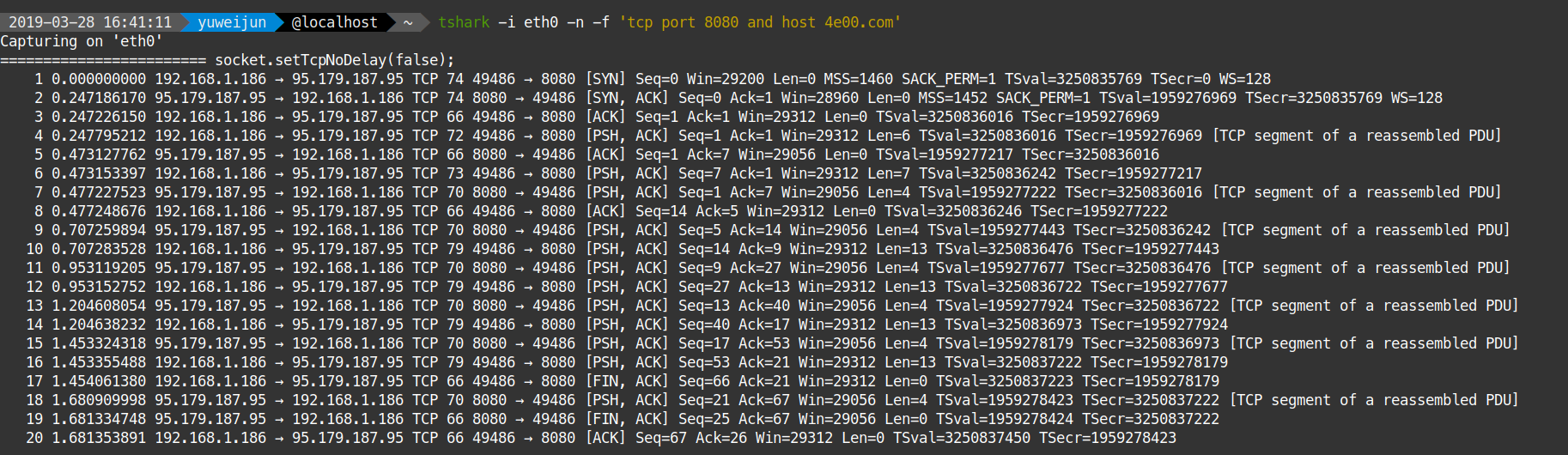第一个数据包不管多小都是即时发送出去的,后面Len为 13 的数据包,都是因为 Nagle 算法生效产生的结果,对比关闭 Nagle 算法的数据可以看到,原来要 28 个数据包往来,开启 Nagle 之后只要 20 个数据包往来,如下图所示。