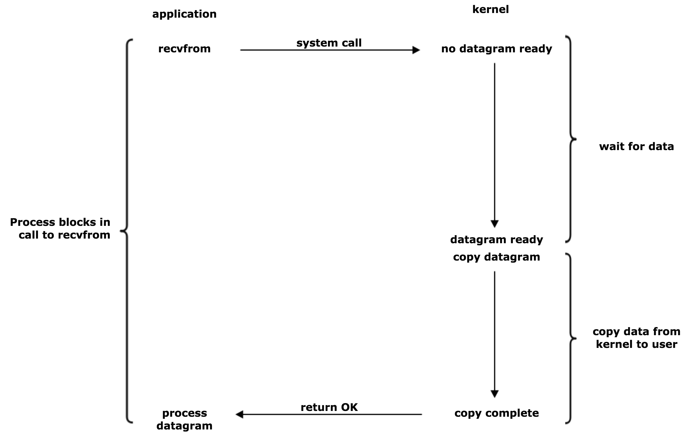 In the figure above, the process calls recvfrom and the system call does not return until the datagram arrives and is copied into our application buffer, or an error occurs. The most common error is the system call being interrupted by a signal, as we described in Section 5.9. We say that the process is blocked the entire time from when it calls recvfrom until it returns. When recvfrom returns successfully, our application processes the datagram.
