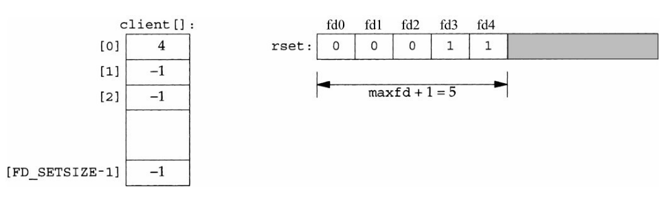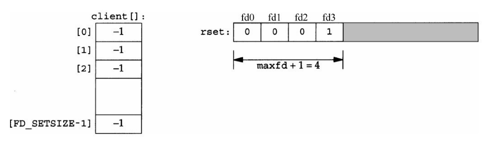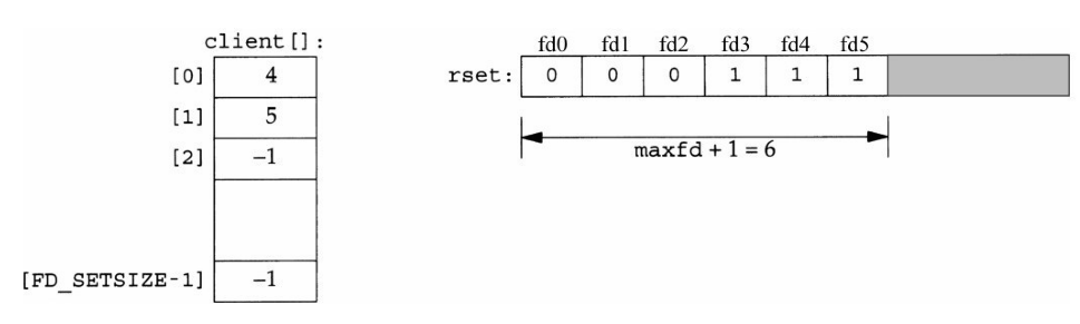 - As clients arrive, we record their connected socket descriptor in the first available entry in the client array (the first entry with a value of –1) and also add the connected socket to the read descriptor set.