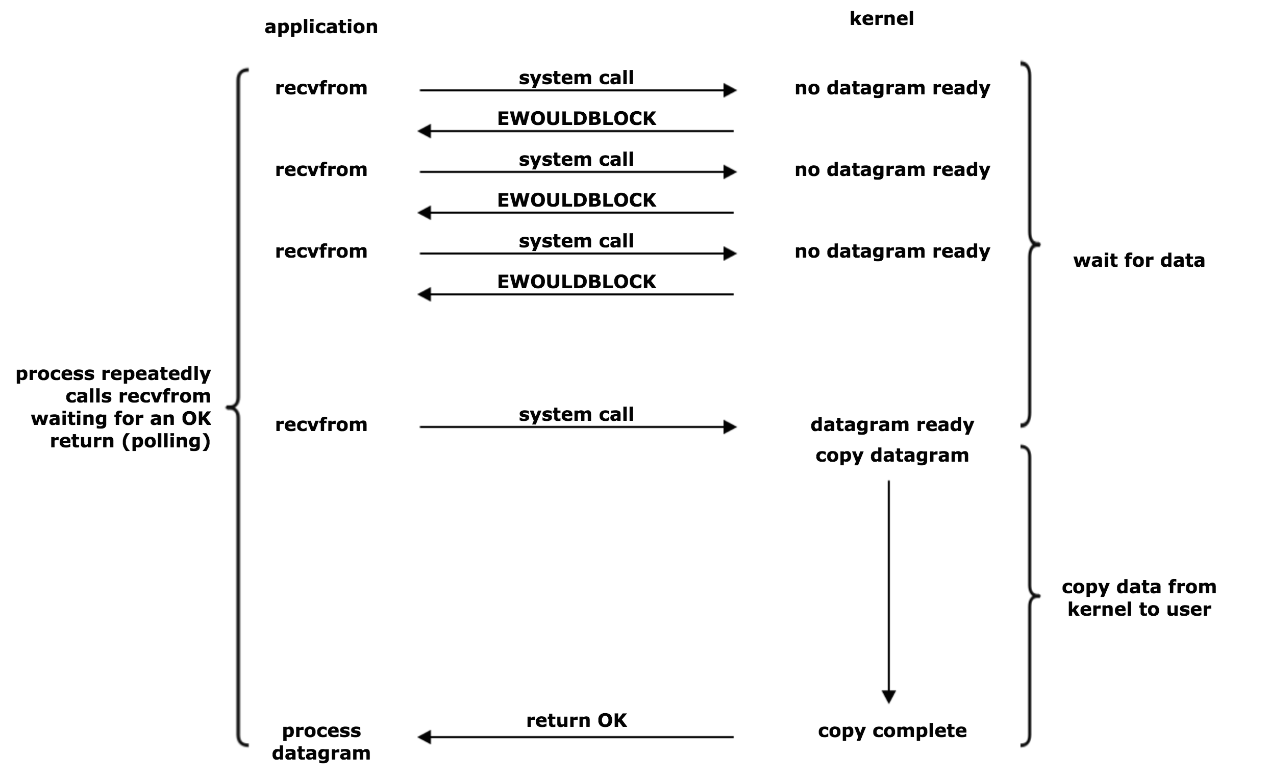 When an application sits in a loop calling recvfrom on a nonblocking descriptor like this, it is called polling. The application is continually polling the kernel to see if some operation is ready. This is often a waste of CPU time, but this model is occasionally encountered, normally on systems dedicated to one function.