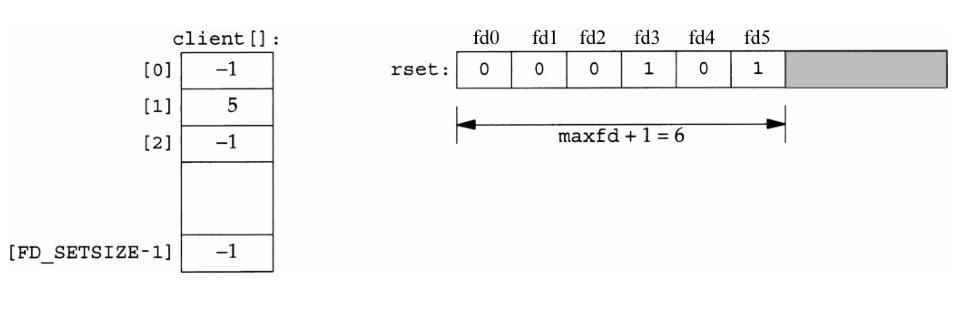 maxiis the highest index in the client array that is currently in use and the variablemaxfd(plus one) is the current value of the first argument to select. - The only limit on the number of clients that this server can handle is the minimum of the two values