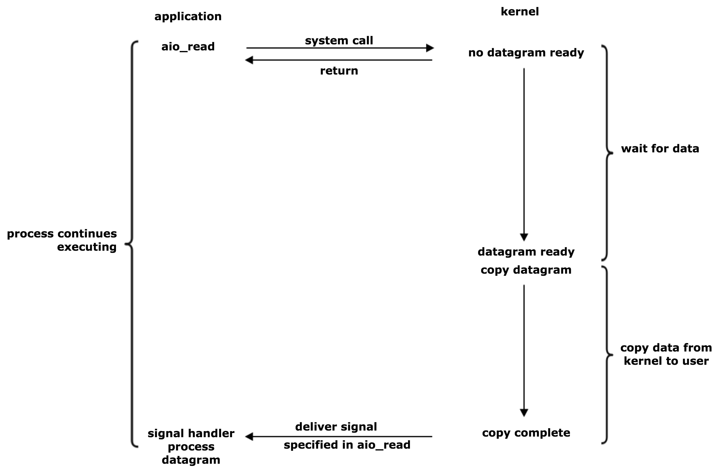 Using these definitions, the first four I/O models (blocking, nonblocking, I/O multiplexing, and signal-driven I/O) are all synchronous because the actual I/O operation (recvfrom) blocks the process. Only the asynchronous I/O model matches the asynchronous I/O definition.