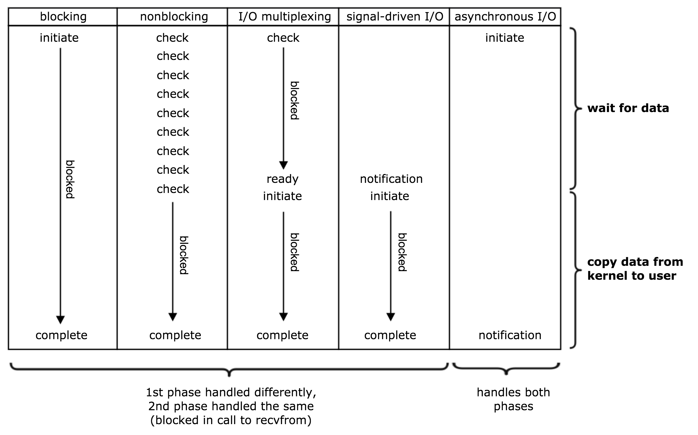 The main difference between the first four models is the first phase, as the second phase in the first four models is the same: the process is blocked in a call to recvfrom while the data is copied from the kernel to the caller's buffer. Asynchronous I/O, however, handles both phases and is different from the first four.
