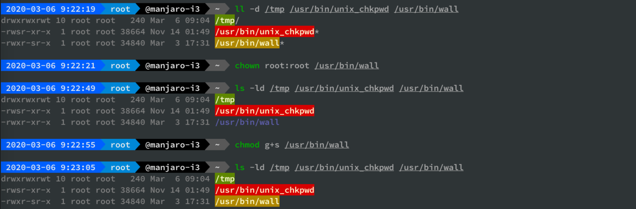 ls -ld /usr/bin/passwd /tmp /usr/bin/walldrwxrwxrwt 12 root root 4096 Jun 14 15:51 /tmp-rwsr-xr-x 1 root root 59640 Jan 25 15:09 /usr/bin/passwd-rwxr-sr-x 1 root tty 30800 May 16 10:41 /usr/bin/wall |