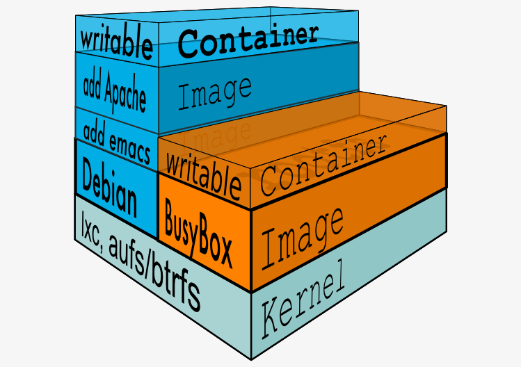 从上面的docker ps结果可以看到,由同一个 IMAGE 通过docker run产生了2个独立的容器,一个容器内部文件修改不会影响另一个容器。IMAGE 和 CONTAINER 的关系,有点类似 Class 和其实例的关系,CONTAINER 只是 IMAGE 运行后的一个实例,可参考这篇关于AUFS的文章和Containers 101: Docker fundamentals这篇介绍 docker 基本原理的文章,从文章中各选了一张图作为示例说明如下。