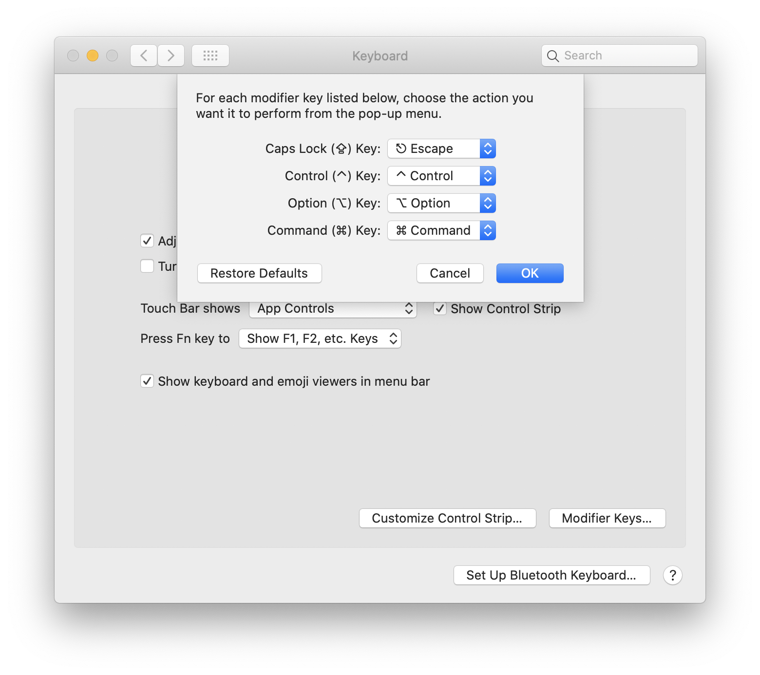 也有不少人在插入模式中,将 jj 或者 jk 映射为 Escape,在英文输入时还是挺方便的,不过这个与中文五笔输入打字时有点冲突,所以不如重用 Caps Lock 键,如下图是在 Mac OS 上的设置: