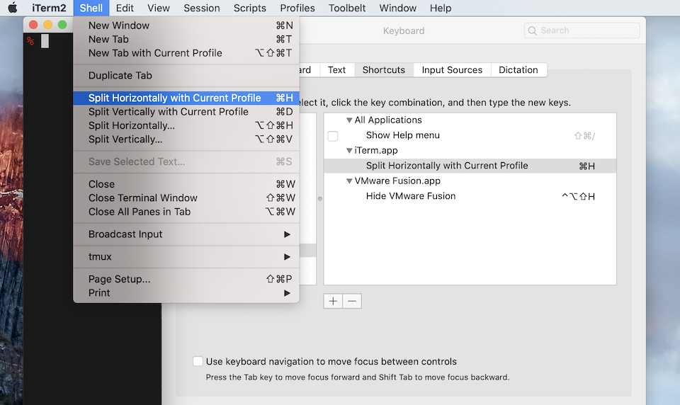 如下示例,我把 iTerm2 水平分隔的快捷键改成 command+H,避免与原来的隐藏功能冲突,也可以修改原来默认的 Command+H 的快捷键,如修改了 VMware Fusion 默认的隐藏快捷键: